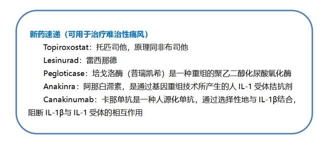 1、新型降尿酸药物:近年来,一系列新型降尿酸药物的出现为痛风治疗带来了新的希望,这些药物包括口服尿酸酶、尿酸转运蛋白抑制剂等,具有更好的降尿酸效果,且副作用较小。